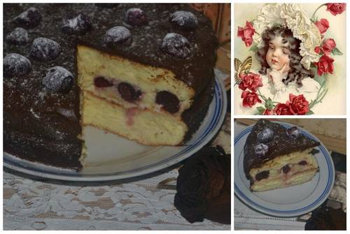 Поверхность торта украсить оставшимися вишенками и сахарной пудрой для имитации заснеженности.