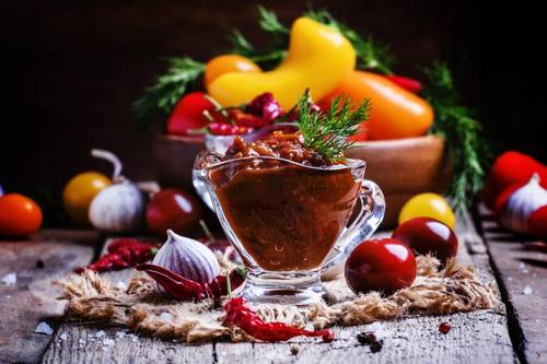 Первый рецепт аджики несколько необычный — отличается от традиционного — там присутствуют кабачки. Они-то и дают нежность, сглаживают резкий вкус классической
