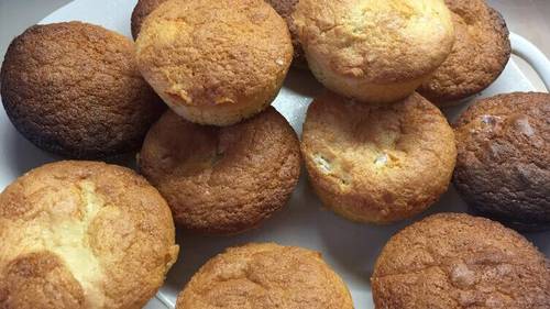 Контрольные образцы с дольками яблок и без начинки (на левом фото они в нижнем ряду, на правом фото — в середине блюда друг на друге) внешне ничем не отличаются от мини-шарлоток со сливами.