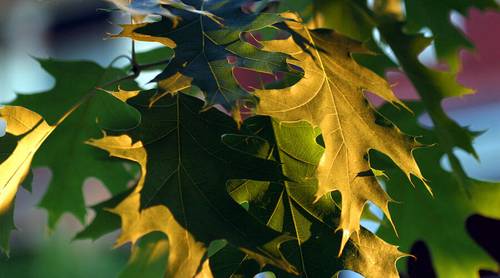 Дубовые листья имеют тёмно-зелёный цвет, продолговатую форму и волнистые края. Плоды дуба представляют собой жёлуди, сидящие на длинных плодоножках.