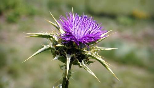 Отличительные приметы: большие шиповатые листья с молочно-белыми «разводами», высокие стебли, крупные фиолетовые корзинки. Цветёт летом, к