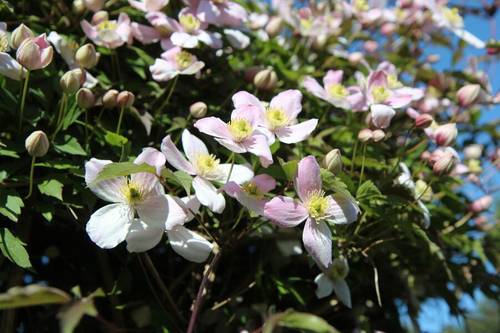 Клематисы, цветущие на побегах прошлого года, не обрезают на зиму. Они цветут рано, но для них реальна угроза вымерзания. Эти растения относятся к группам клематиса цветистого и клематиса раскидистого. Цветки белые и светлых тонов — например, сорт «Флорида Биколор».