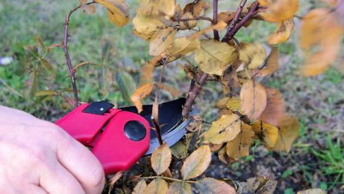 Перед укрытием роз на зиму следует обрезать сильные побеги на высоту примерно 40−50 см, полностью вырезать тонкие и слабые побеги и удалить все листья (листья с куста лучше всего удалять снизу вверх и не сразу все, а в течение нескольких дней). В сухую безветренную погоду обработать фунгицидными средствами, например, 1%-м раствором бордоской жидкости или 3%-м раствором медного купороса.