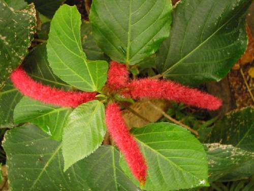 - акалифа гаитянская — имеет поникающие нежные побеги, листья сердцевидные, светло-зелёные, ярко-красные пушистые соцветия длиной 3−10 см прекрасно дополняют это очаровательное ампельное растение;