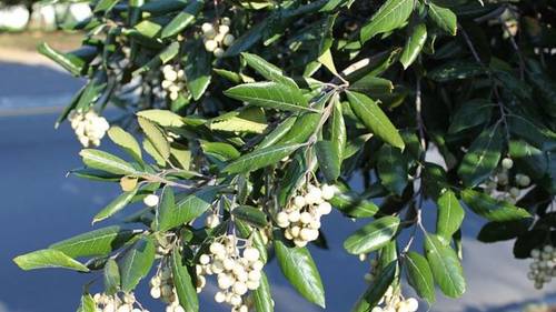 Мелкие цветки собраны в верхушечные соцветия. Некрупные, шаровидные плоды имеют белоснежную окраску и красиво смотрятся на фоне глянцевых листьев.