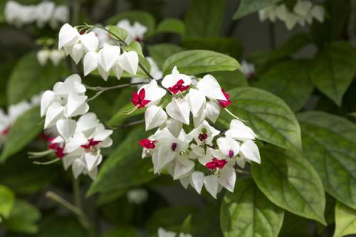Самый распространённый вид — клеродендрум Томпсона. Восхитительная лиана с крупными ярко-зелёными листьями с самой весны и до середины лета украшена гроздьями белоснежных цветов, имеющих красный венчик.