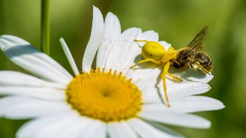 На жёлтый цветок, которым любовался паучок, села бабочка, окунула хоботок в его серединку и начала лакомиться нектаром. Вдруг из цветка вытянулись чьи-то лапы и мгновенно схватили бабочку. Хозяину быстрых лап уже не надо было скрываться, он во весь рост уселся на цветке и принялся завтракать. Искусным охотником оказался маленький ярко-жёлтый паучок.