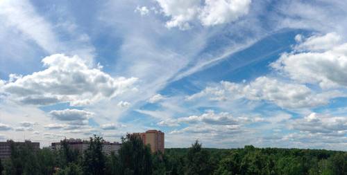 Наблюдая за ураганом из Восточного Подмосковья, мне удалось запечатлеть бушевавший в Москве ураган со стороны. Перед самой грозой, докатившейся и до нас, выглянул в окно и увидел картину, заставившую немедленно взять в руки телефон. Поскольку только панорама могла эффективно передать всю полноту увиденного природного явления, сделал несколько снимков. Пары снимков для создания панорамы оказалось вполне достаточно…