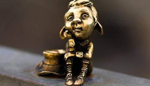 С Эстакадного моста мы в очередной раз полюбовались уже хорошо знакомой нам Рыбной деревней, в которой никогда не торговали рыбой, и под приятные воспоминания о купленном на Куршской косе аппетитном копченом балтийском угре, подошли к Музею изобразительных искусств. Там нас поджидал мечтательный, пишущий стихи Папа Лео из небольшого семейства калининградских хомлинов — милых человекоподобных существ, пытающихся найти свой дом в Калининграде. Отсюда и хомлины (от английского home — дом).