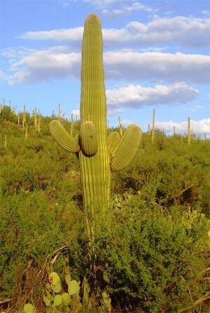 В штате Аризона произрастает самый большой кактус в мире — Сагуаро, или Карнегия гигантская (Carnegiea gigantea). Его высота может достигать 15−20 метров. Продолжительность жизни — около 250 лет. Сагуаро растет очень медленно, за 20 лет он может вырасти до высоты полутора метров. Когда кактус достигает высоты 7−8 метров, у него начинают отрастать боковые побеги или «руки». Количество «рук» может варьировать от 1 до 15.