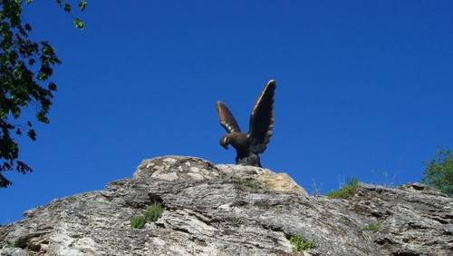 Орла оккупировала влюблённая парочка, фотографируясь с ним во всевозможных ракурсах, рядом в ожидании топчутся ещё несколько любителей попозировать. Присев на скалу, ловлю момент: как только парочка отходит, делаю кадр на память и я.
