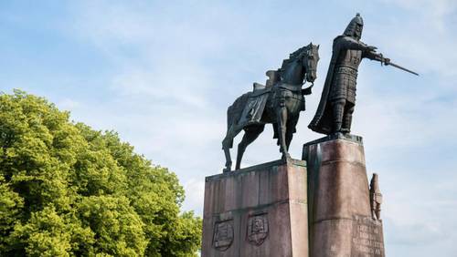 Если от Ратуши идти прямо, то можно выйти на главную, Кафедральную площадь, на которой находится «конь», вернее, памятник основателю города — князю Гедиминасу, установленный в 1996 году. Кажется, практически в каждом городе есть свой человек на коне, где обычно назначают встречи. Хотя здесь князь Гедимин не верхом. На этой площади устраивают ярмарки, гулянья, концерты.