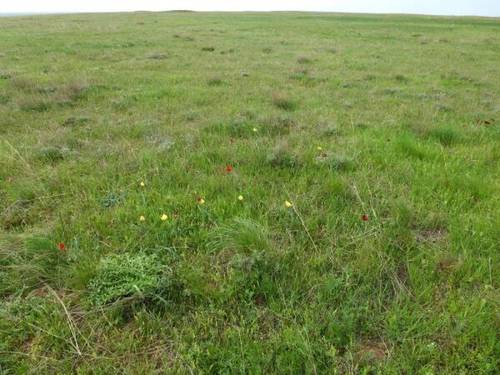 Увидев на возвышенности несколько древних курганов и ведущую к ним еле заметную степную дорогу, я решил свернуть с трассы и подняться к древнему могильнику, чтобы сделать остановку и, возможно, найти тюльпаны. Но степь не спешила сразу раскрывать свои тайны… Не успел я подумать о том, что, может, тюльпаны уже отцвели, как степь раскинула перед нами желто-красное покрывало только что распустившихся цветов.