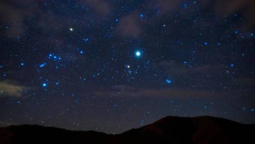 Новогоднее небо около полуночи украшено яркими и примечательными созвездиями. В южной части царственно расположился охотник Орион. Его контур с тремя звёздочками в поясе, лежащими как будто на одной прямой, трудно не узнать. Красная звезда левее и выше пояса — Бетельгейзе, а ниже и правее находится голубоватый Ригель. Это очень крупные и горячие звёзды, по диаметру во много раз превосходящие Солнце.