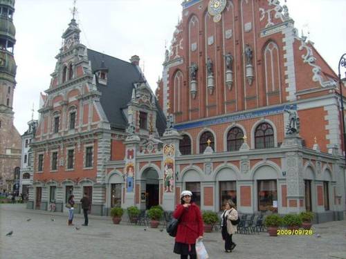 Ратушная площадь устлана булыжниками, центральное место на площади занимает фигура святого Роландса — покровителя ганзейских торговцев. Во всем своем великолепии предстает Дом Черноголовых с прилегающим к нему Швабским домиком. Изначально здание было построено как увеселительное заведение для членов различных рижских обществ, а с 17 века полноправными хозяевами стали немецкие торговцы, члены общества Черноголовых. Здание, которое являлось гордостью рижан, было полностью разрушено во время Второй мировой войны.