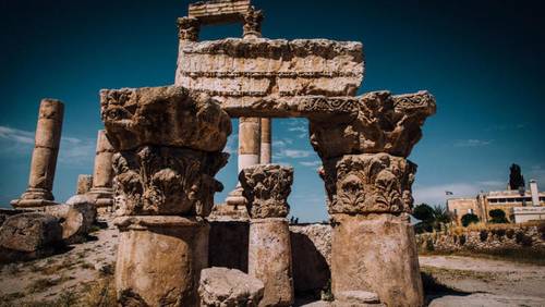 Слои времени. Византийская базилика шестого века, останки дворца Омейядов, относящийся к эпохе Арабского Халифата и античные колонны времен римского Декаполиса.