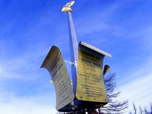 Чтобы визуально обозначить географический центр России, 21 августа 1992 года в Эвенкию была направлена вертолетами большая научная группа. Ее участники привезли с собой семиметровый монумент с четырьмя металлическими страницами в виде как бы свитков. Их количество символизировало четыре стороны света. Спустя неделю состоялось торжественное открытие монумента.