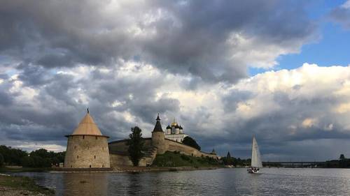 Жемчужина Пскова — древний Кремль (Кром), открывает свои неприступные стены с западной стороны. Здесь соединяются две реки, два водных пути, Пскова и Великая. Крепость на холме — тактически удачное решение. За всё время своего существования не один раз она отражала наступление врагов. Уже много веков город растет вокруг Кремля, дивного, белокаменного, с семью высокими башнями, часть которых гордо отражается в стеклянной глади воды. А Собор Святой Троицы виден своими золотыми маковками куполов из многих районов Пскова.