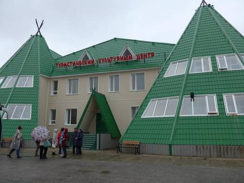Здание Центра построено совсем недавно, сияет красками и чистотой, боковые части стилизованы под ненецкие чумы. Здесь нас встретили руководитель и две милых женщины — экскурсоводы. Сначала посмотрели офис Центра, там есть небольшая гостиница, магазин традиционных ненецких сувениров, зал для проведения мероприятий.